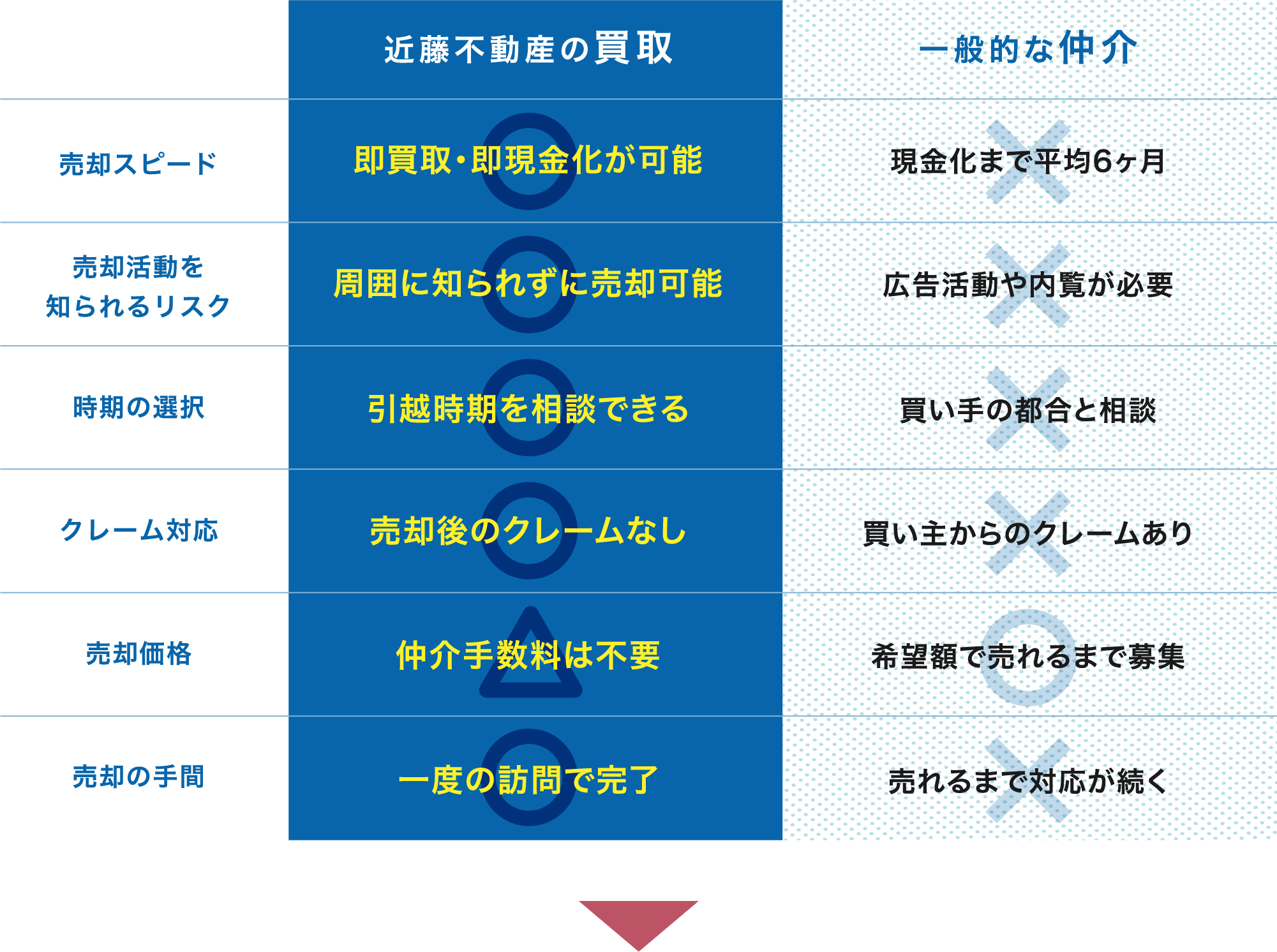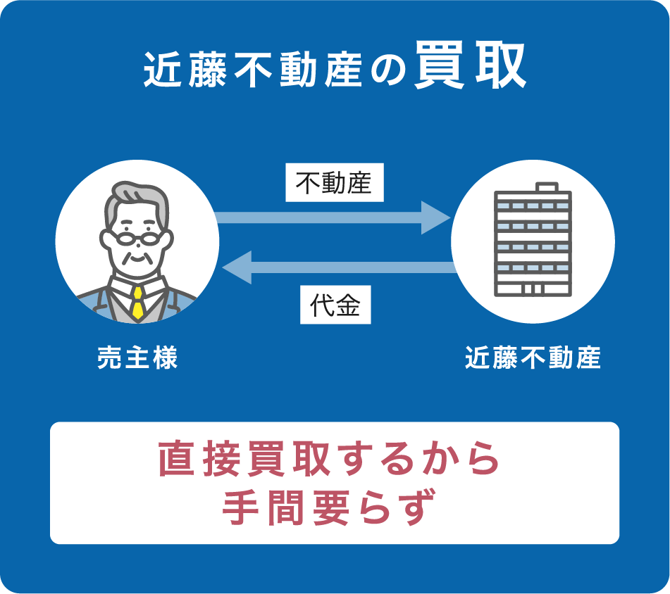 お急ぎの場合や、ご近所に売却を知られたくない場合など、お客様のご希望により、近藤不動産が直接買い取りいたします。
