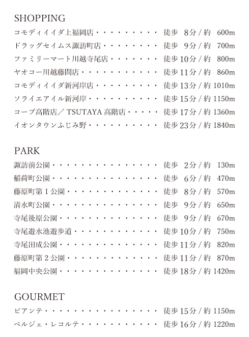 イオンタウンふじみ野やヤオコーなどの商業施設がオープンし近年発展目覚ましい「上福岡」エリアの利便性と、駅周辺の区画整理が進み、駅舎改修も行われた「新河岸」エリアの将来性の2つの恩恵があるロケーション。