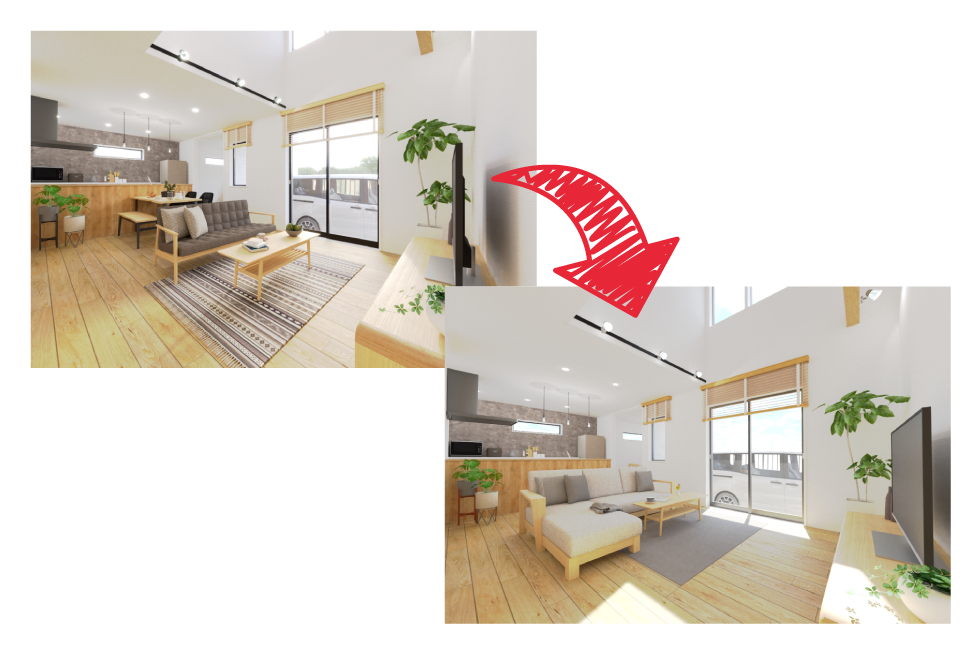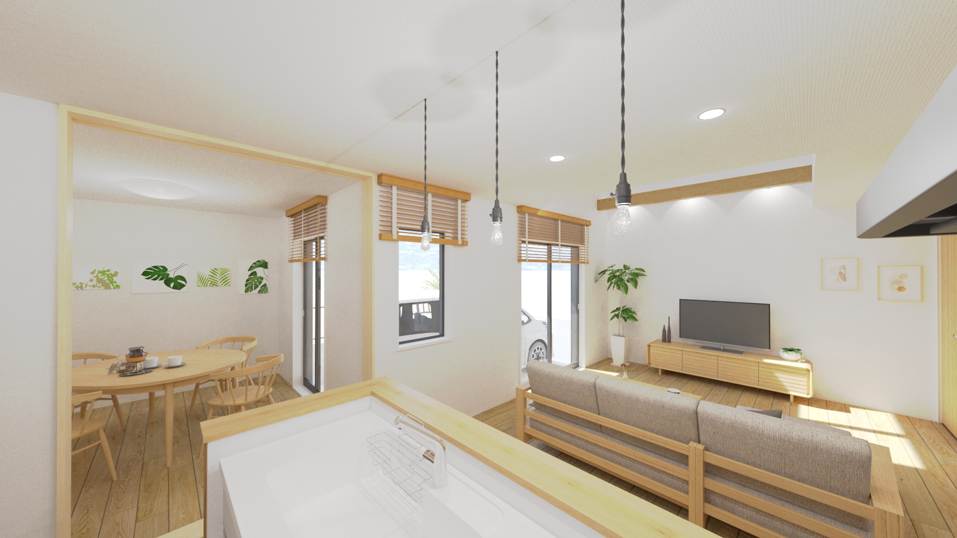 フレキシブルルームをダイニングとして利用することで広いリビングを実現できます。