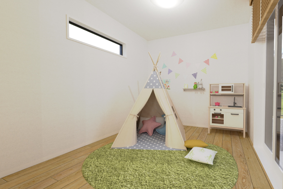 リビングの隣にキッズルームがあれば、小さなお子様のお昼寝や遊んでいるのを家事をしながらでも見守れて安心です。