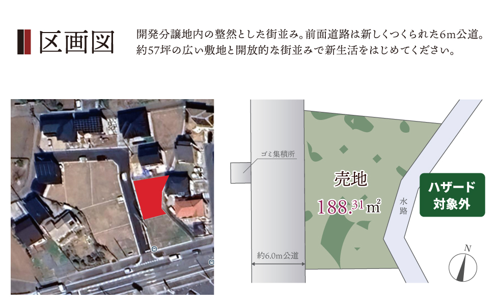 前面道路6m公道、開発区域内の整然とした街区に約57坪の広い土地を取得しました。