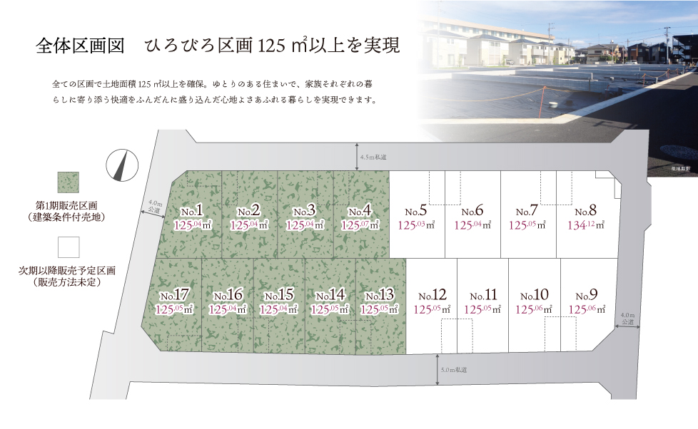 全区画125㎡を超える整形地に自由設計で建築できます。